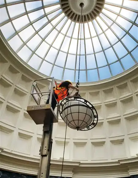 This is the chandelier from the library building of the New York Botanical Garden. It has a zodiac ring around it. The fixture is from early 1900’s original to the Watson building. We took it down for rewiring, cleaning and some minor repairs.
